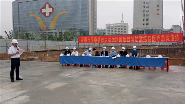 5月12日上午,孝感市傳染病救治基地舉行了消防演練及醫(yī)療急救演練,一醫(yī)院領導,區(qū)代建辦及現(xiàn)場各參建單位工作人員共計50余人參加了此次安全演練。